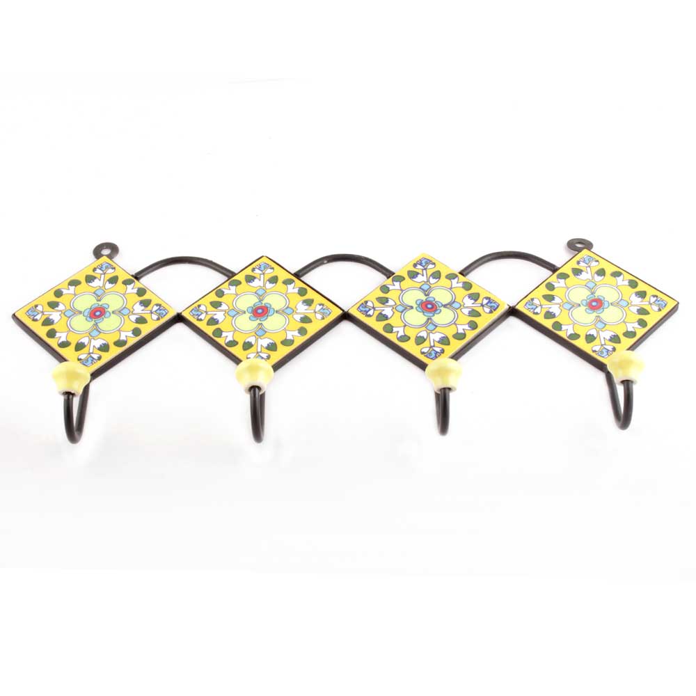 Yellow And White Tiny Flower Ceramic Tiles Hooks. When Put on Wall or Cabinet It is An Art in Itself. The Metal Part of this Hook is Black Powder Coated.