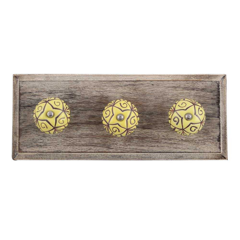Yellow Base Brown Etched Ceramic Floral Wooden Hook. A Perfect Complement to the Soft Tone of the Wood are these White Traditional Hat & Coat Hook Made of Genuine Porcelain and Brass. It can be use to Hang Jewellery, Leashes, Towels, Scarves, Light Weight Sweaters, Caps Etc.