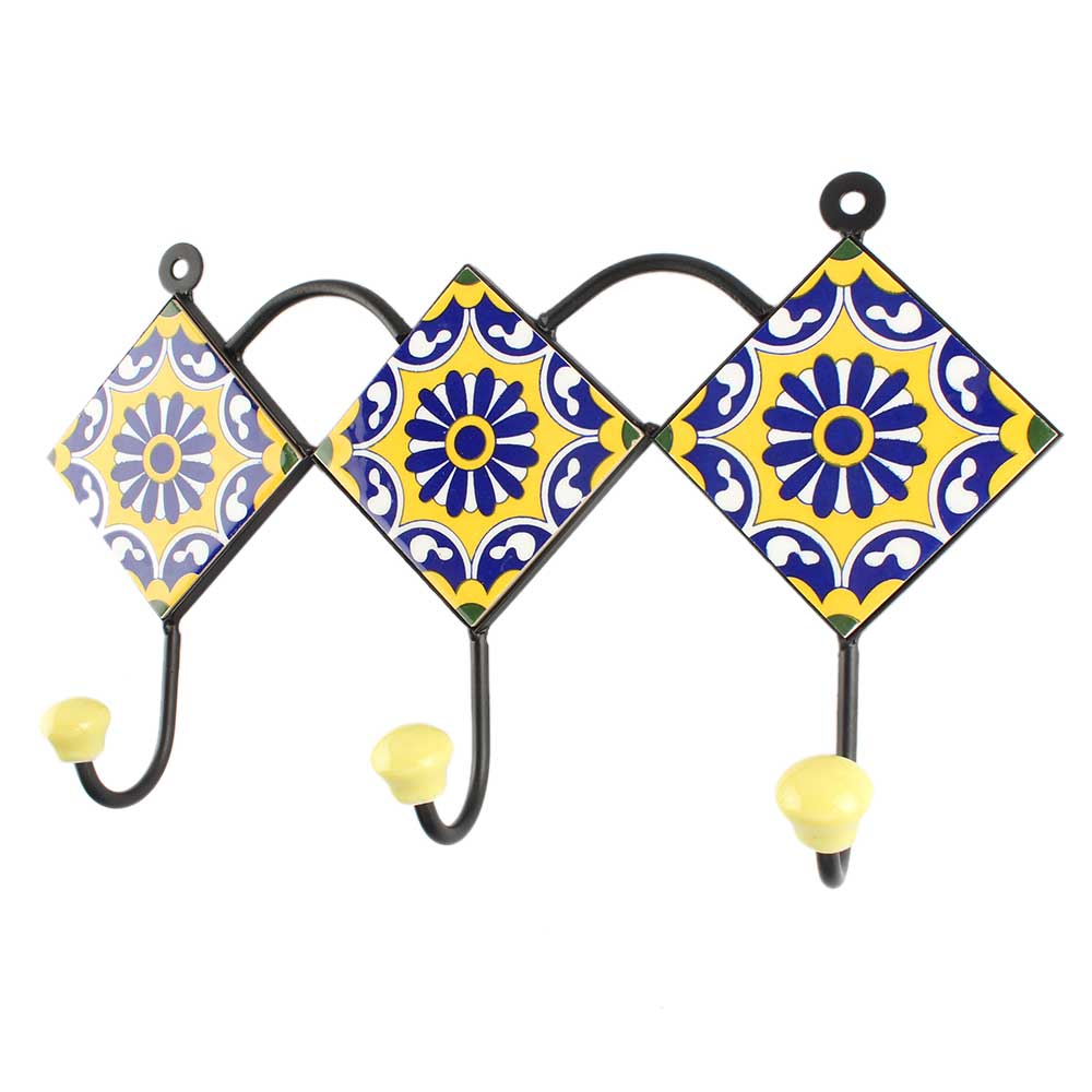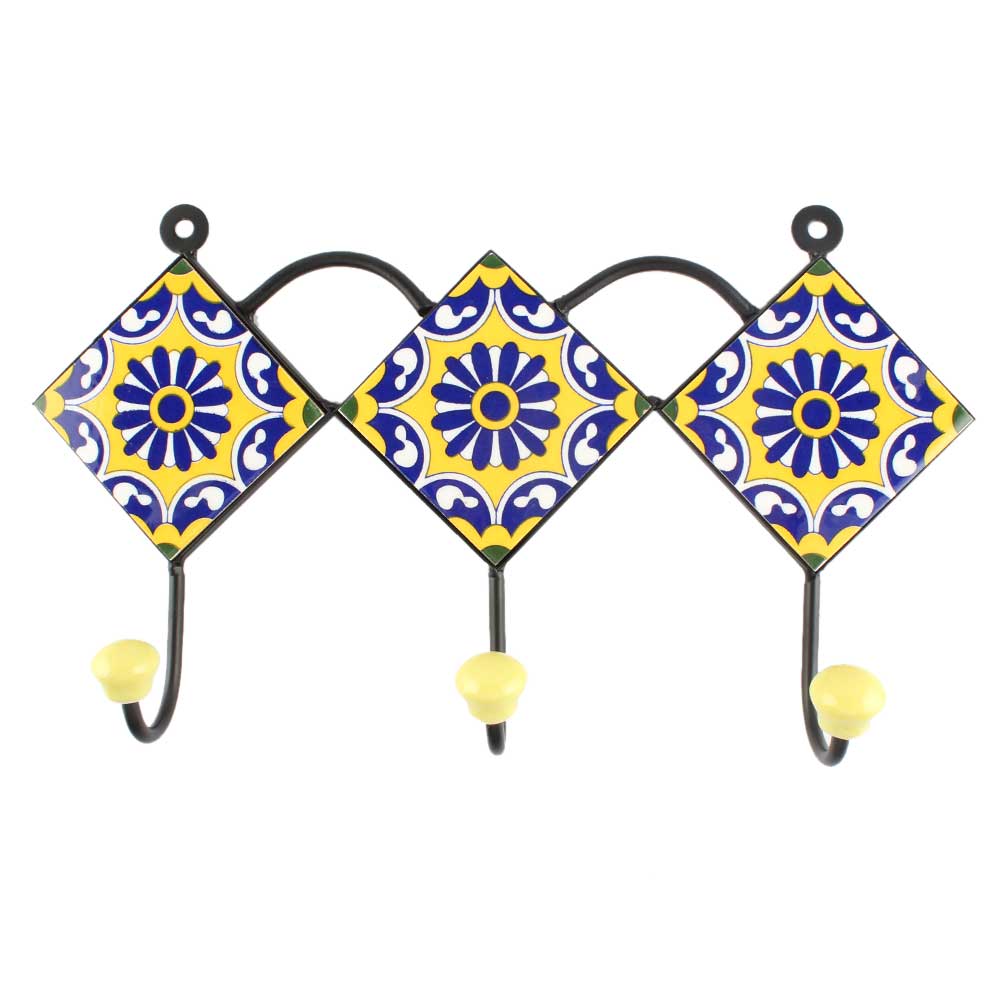 Yellow Base Navy Blue Wheel Flower Ceramic Tile Hook. When Put on Wall or Cabinet It is An Art in Itself. The Metal Part of this Hook is Black Powder Coated.