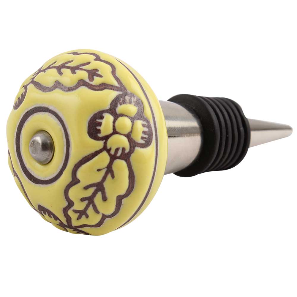 Yellow Brown Leaf Flower Etched Ceramic Wine Stopper.zinc alloy wine bottle stopper with attractive Jute Bag Packaging.