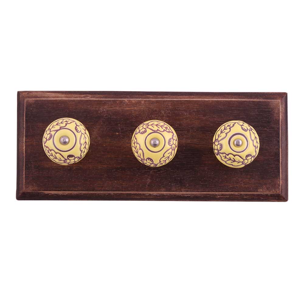 Yellow Brown Leaf Flower Etched Ceramic Wooden Hook. A Perfect Complement to the Soft Tone of the Wood are these White Traditional Hat & Coat Hook Made of Genuine Porcelain and Brass. It can be use to Hang Jewellery, Leashes, Towels, Scarves, Light Weight Sweaters, Caps Etc.