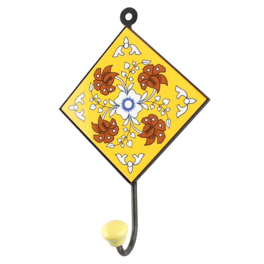 Yellow Ceramic Floral Tiles Hook . When Put on Wall or Cabinet It is An Art in Itself. The Metal Part of this Hook is Black Powder Coated.