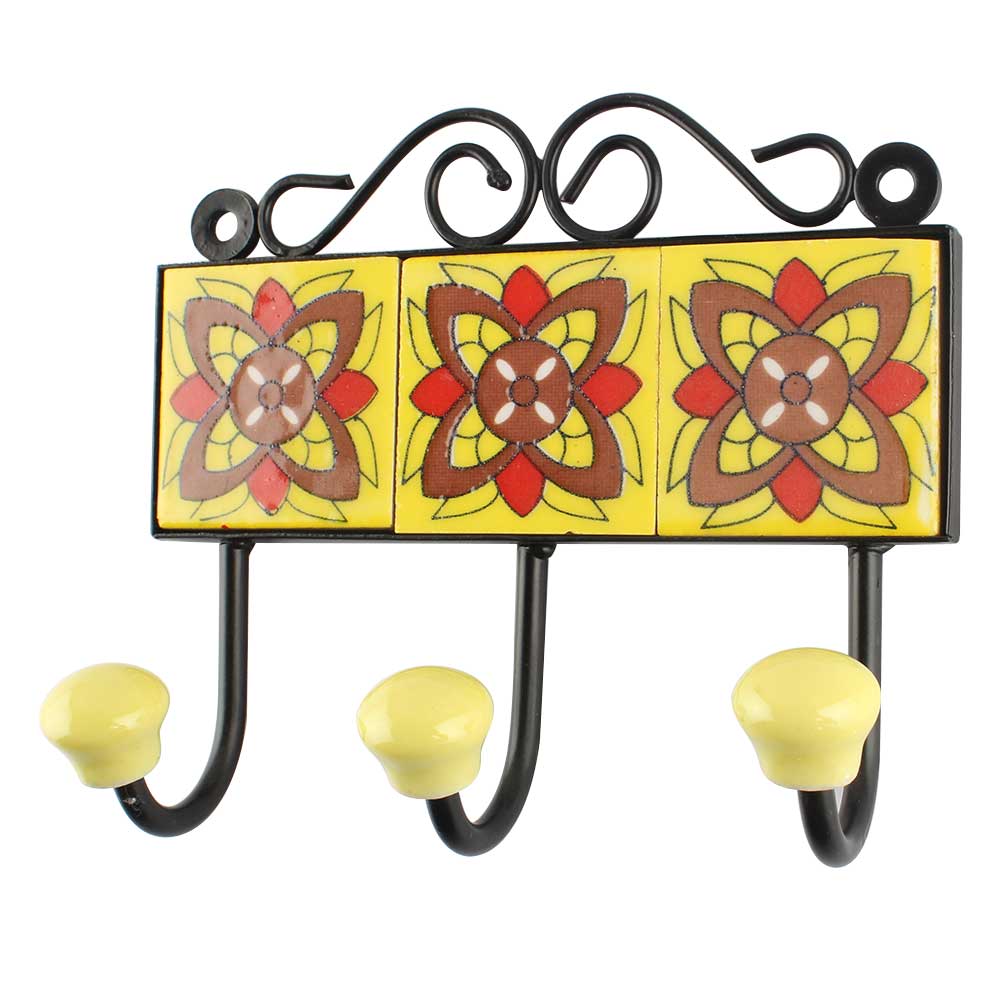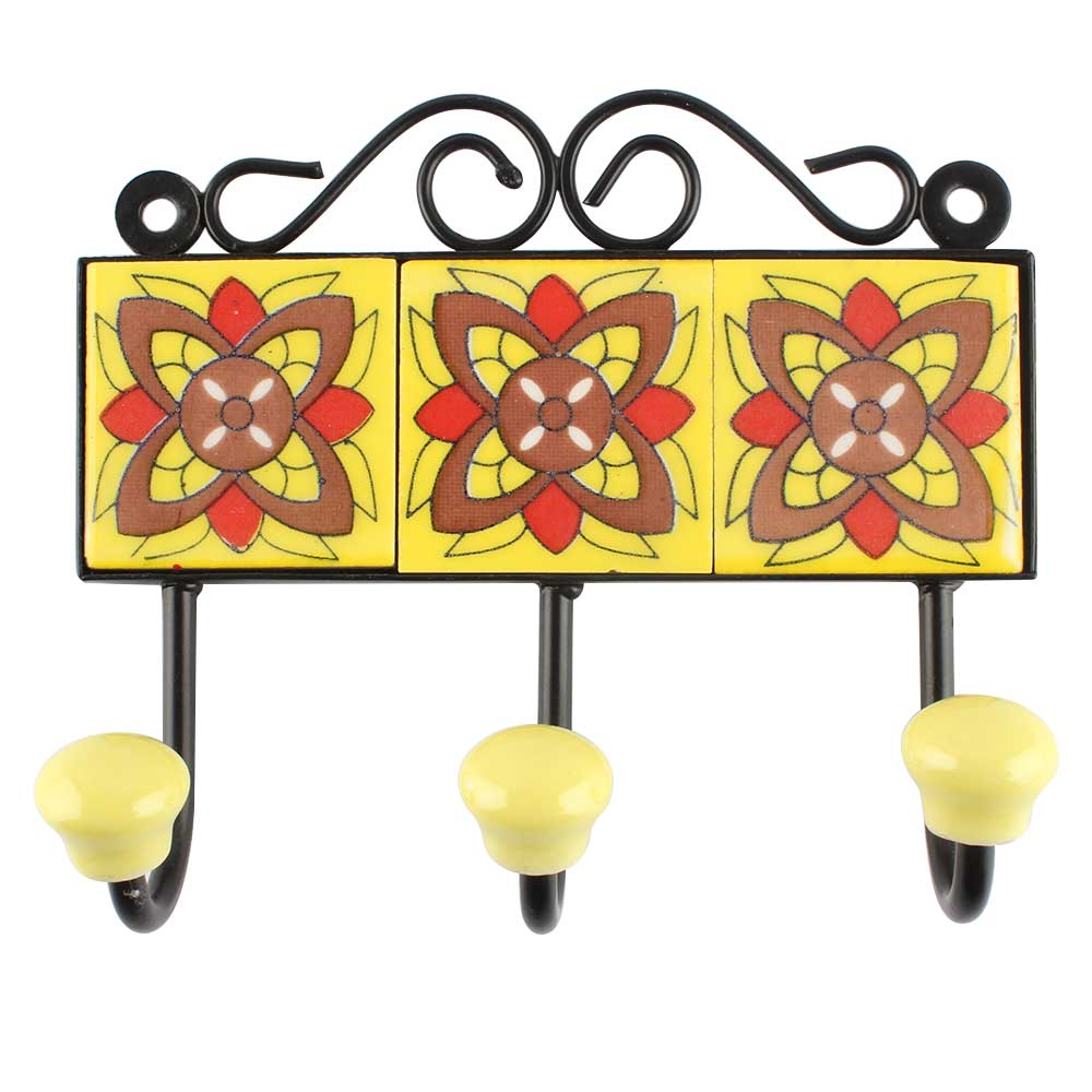 Yellow Ceramic Floral Tile Wall Hook. When Put on Wall or Cabinet It is An Art in Itself. The Metal Part of this Hook is Black Powder Coated.
