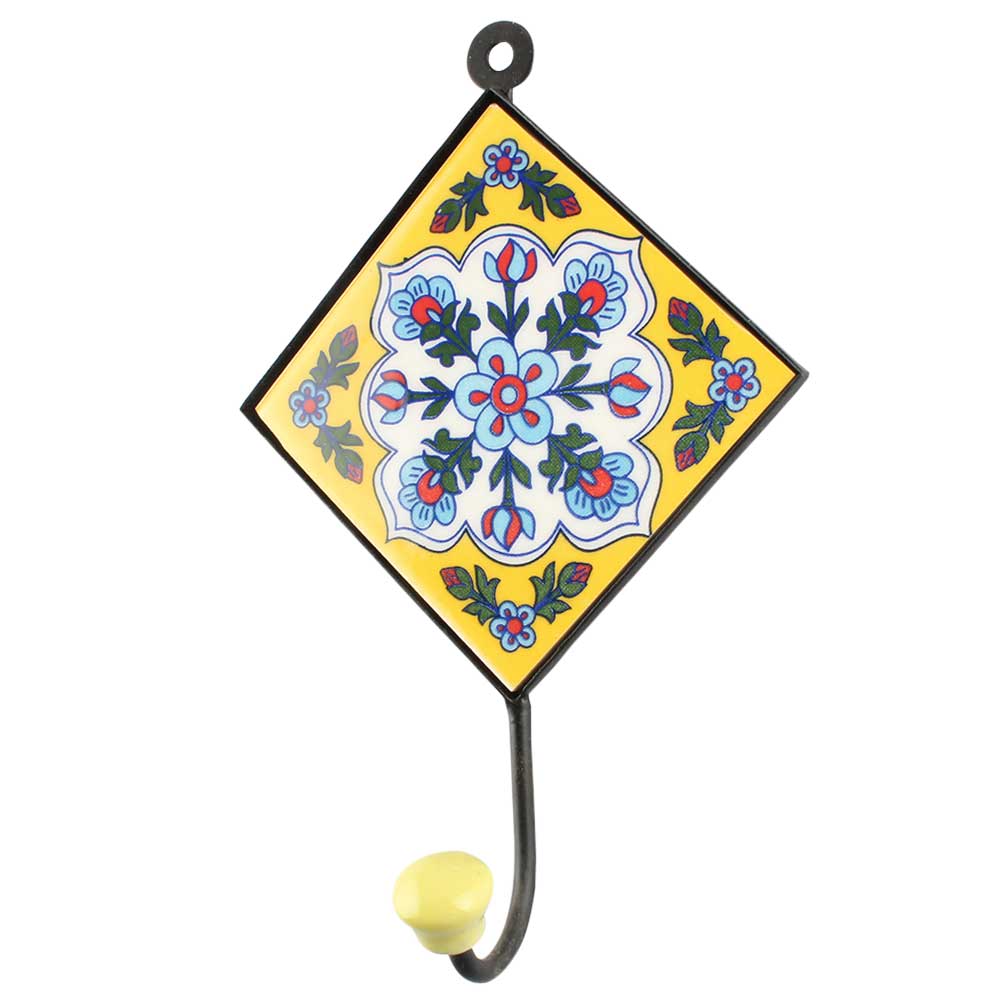 Yellow Ceramic Floral Tiles Hook . When Put on Wall or Cabinet It is An Art in Itself. The Metal Part of this Hook is Black Powder Coated.