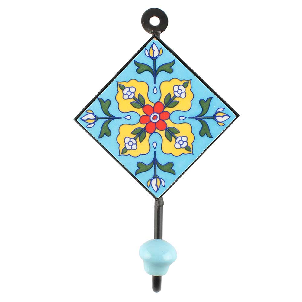 Yellow Ceramic Floral Tiles Hooks. When Put on Wall or Cabinet It is An Art in Itself. The Metal Part of this Hook is Black Powder Coated.