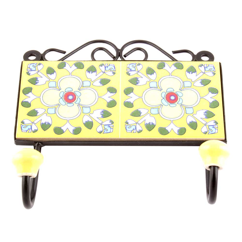Yellow Ceramic Floral Tiles Hooks Online. When Put on Wall or Cabinet it is an Art in itself. The Metal Part of this Hook is Black Powder Coated.