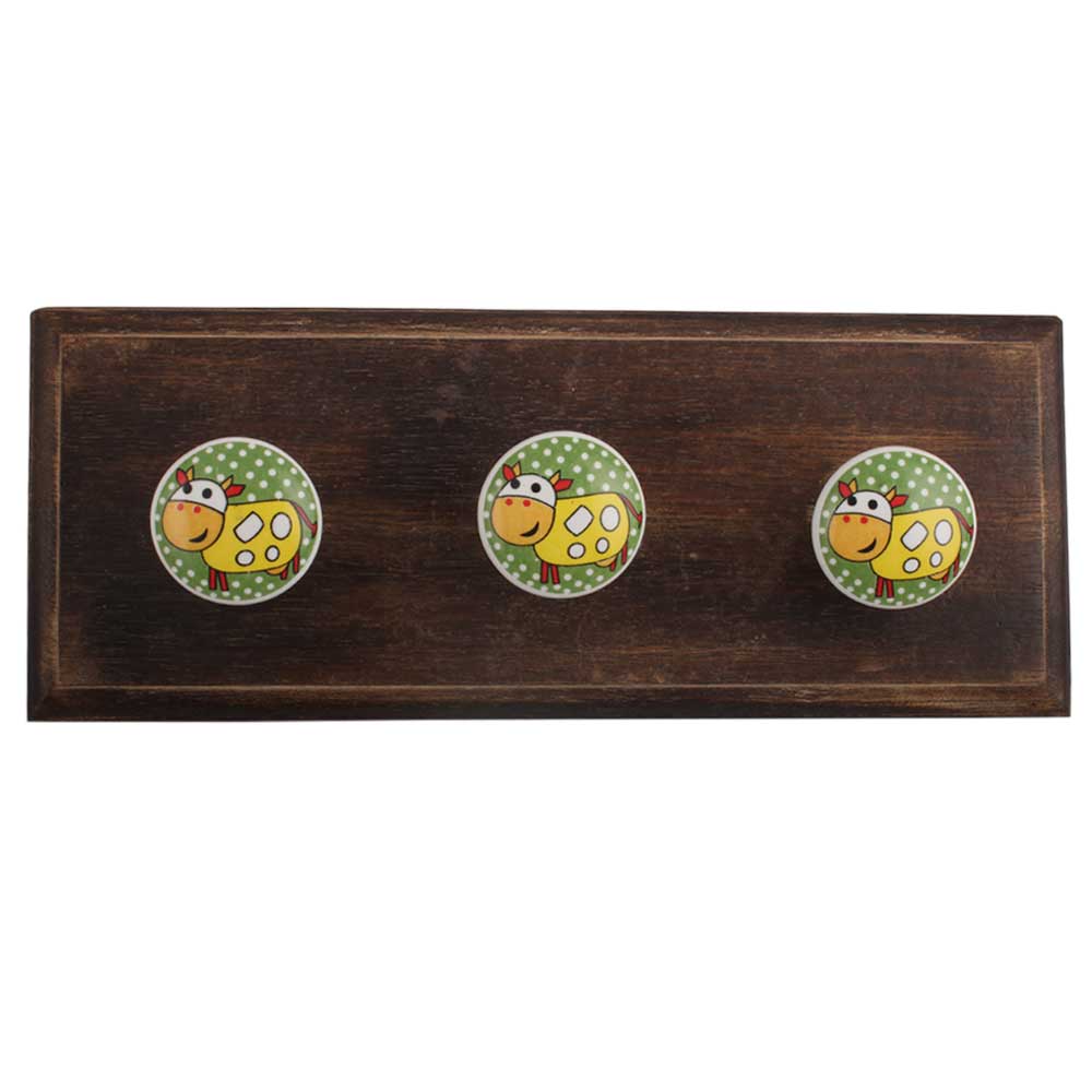 Yellow Cow Ceramic Flat Wooden Hook. A Perfect Complement to the Soft Tone of the Wood are these White Traditional Hat & Coat Hook Made of Genuine Porcelain and Brass. It can be use to Hang Jewellery, Leashes, Towels, Scarves, Light Weight Sweaters, Caps Etc.