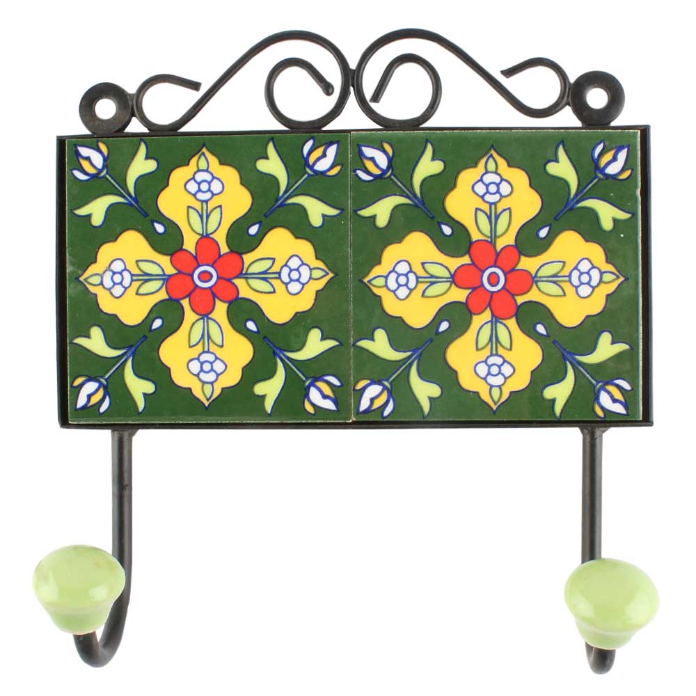 Yellow Floral Ceramic Tile wall Hook. When Put on Wall or Cabinet It is An Art in Itself. The Metal Part of this Hook is Black Powder Coated.