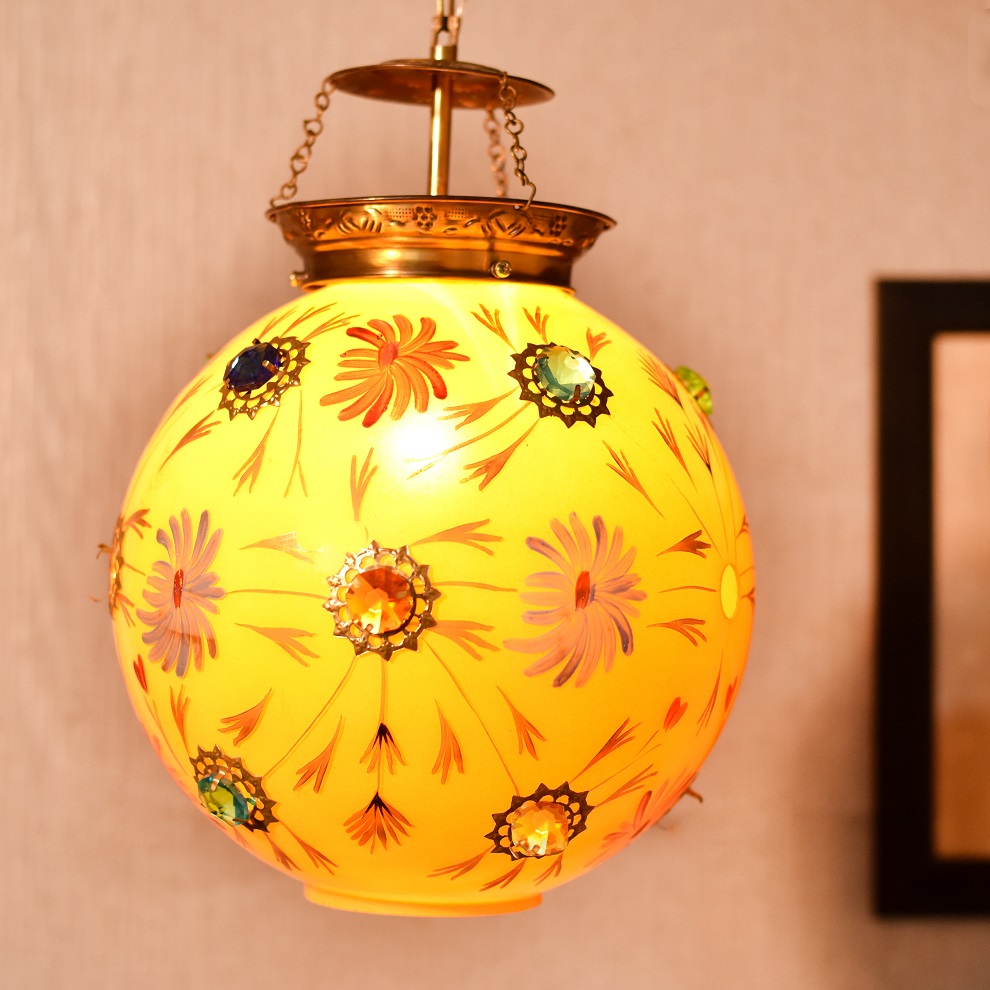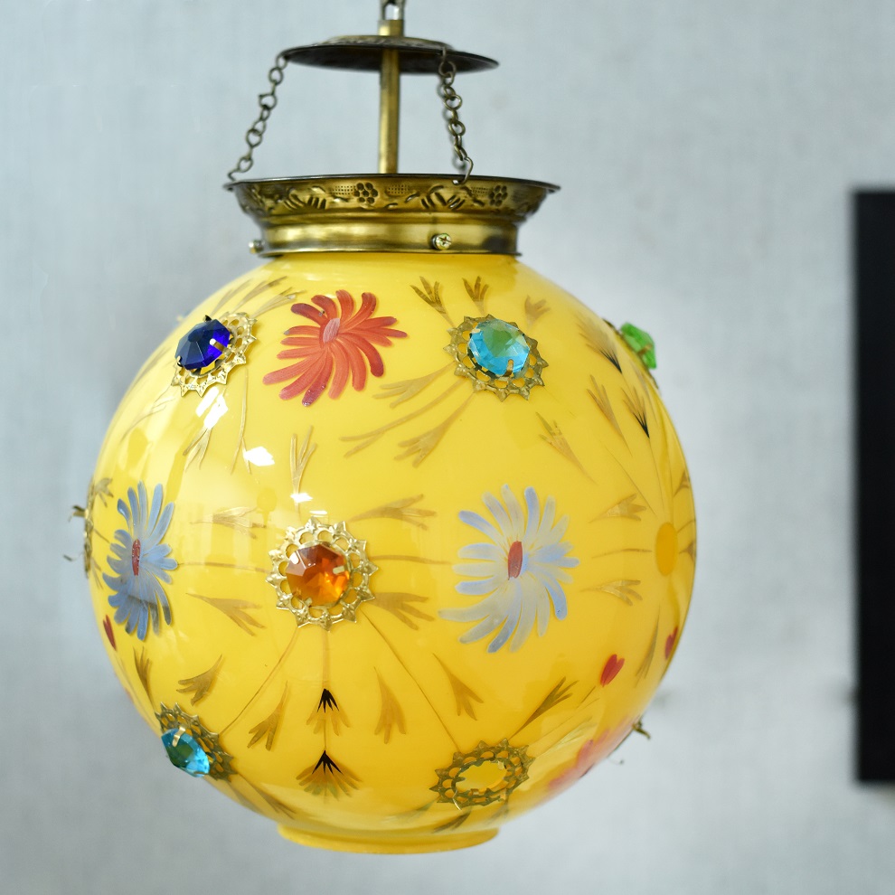 Yellow Flowery Glass and Brass Pendent Ceiling Lamp.