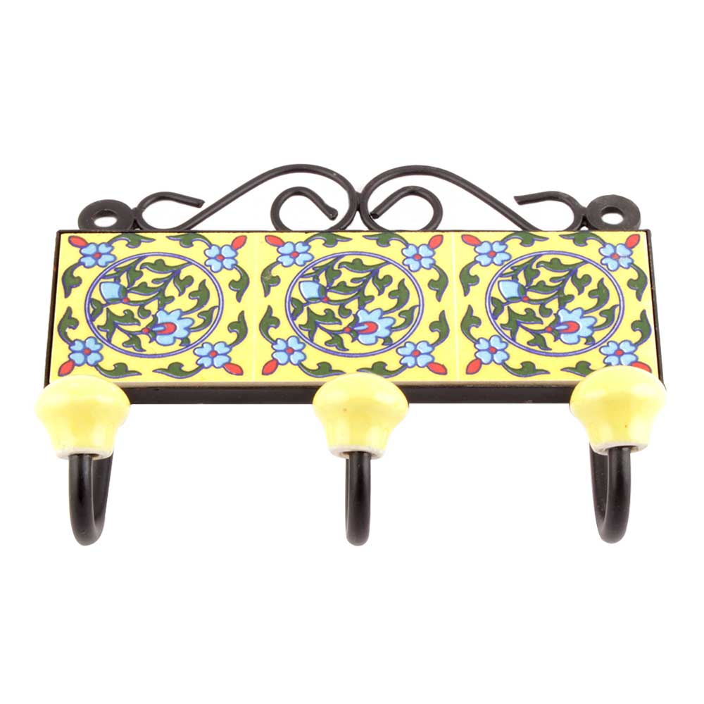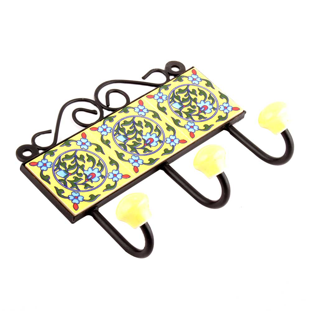 Yellow Forest Green Leaf Floral Tiles Hook. WhenPut on Wall or Cabinet it is an Art in itself. The Metal Part of this Hook is Black Powder Coated.