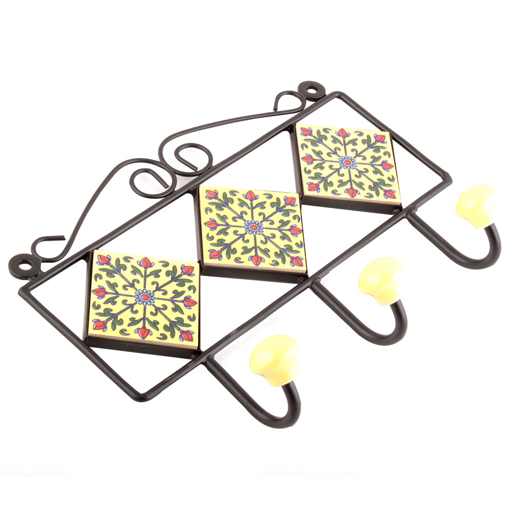 Yellow Forest Green Leaf Tiles Hooks.When Put on Wall or Cabinet it is an Art in itself. The Metal Part of this Hook is Black Powder Coated.