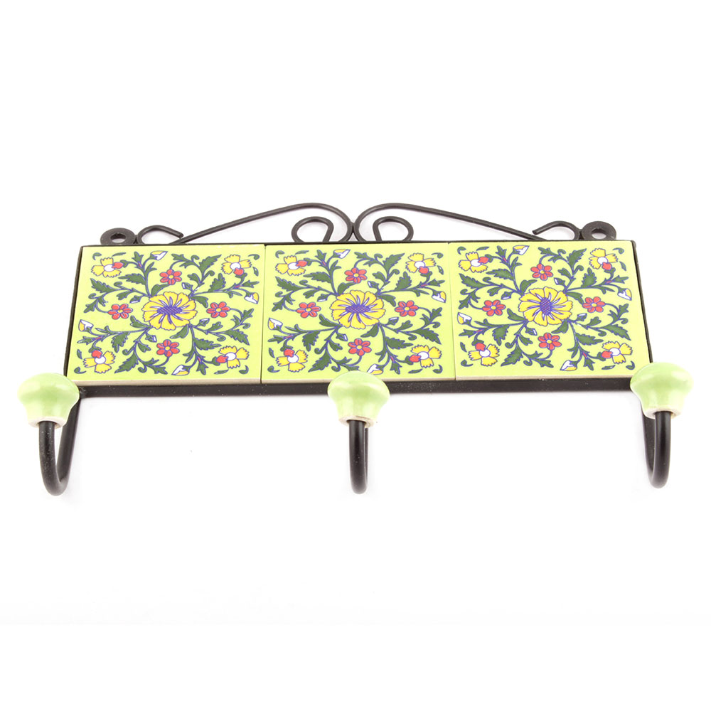 Yellow Forest Green Wheel Floral Tiles Hooks Online. When Put on Wall or Cabinet it is an Art in itself. The Metal Part of this Hook is Black Powder Coated.