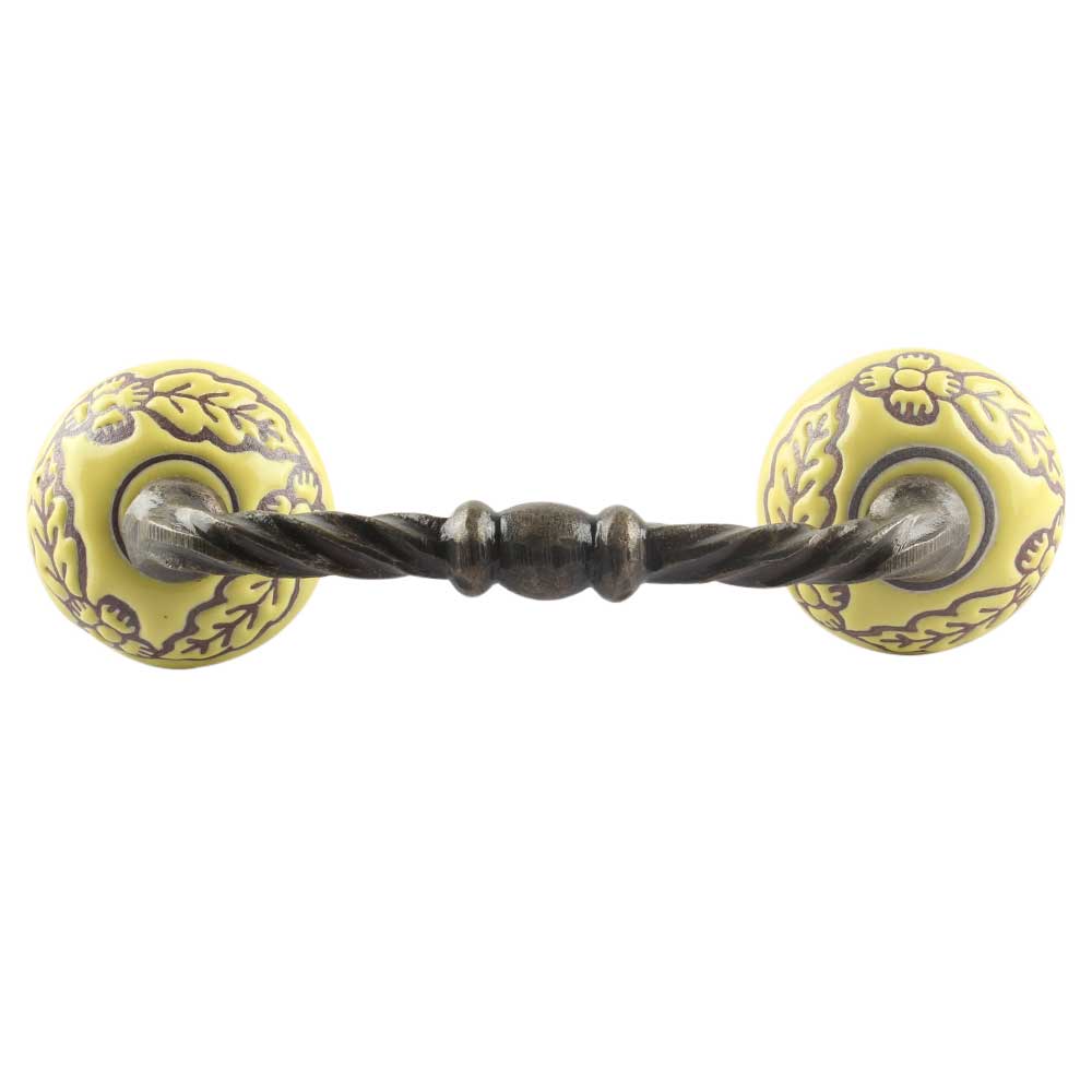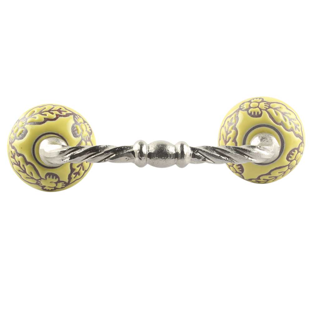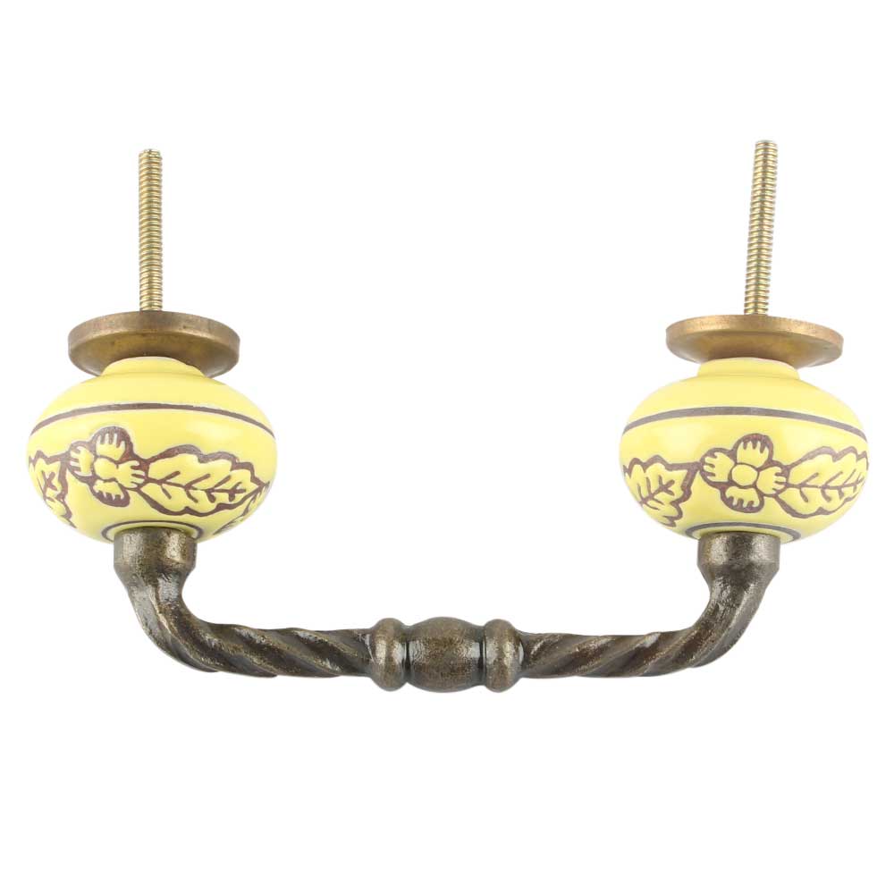 Yellow Leaf Flower Etched Ceramic Cut Bridge Handle. Ideal for Drawer, Dresser, Cabinet, Wardrobe, Cupboard and Almirah etc.