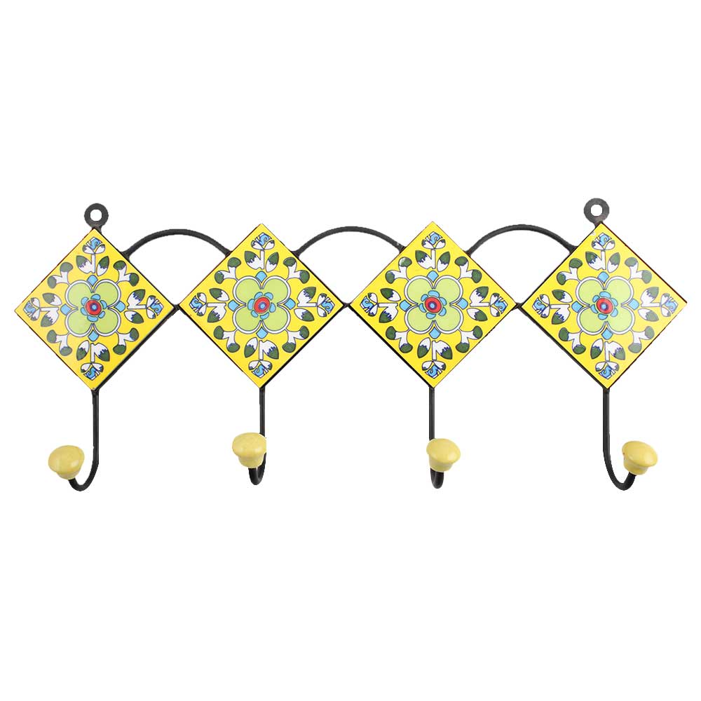 Yellow Light Green Floral Tiles Hook. When Put on Wall or Cabinet It is An Art in Itself. the Metal Part of This Hook is Black Powder Coated.