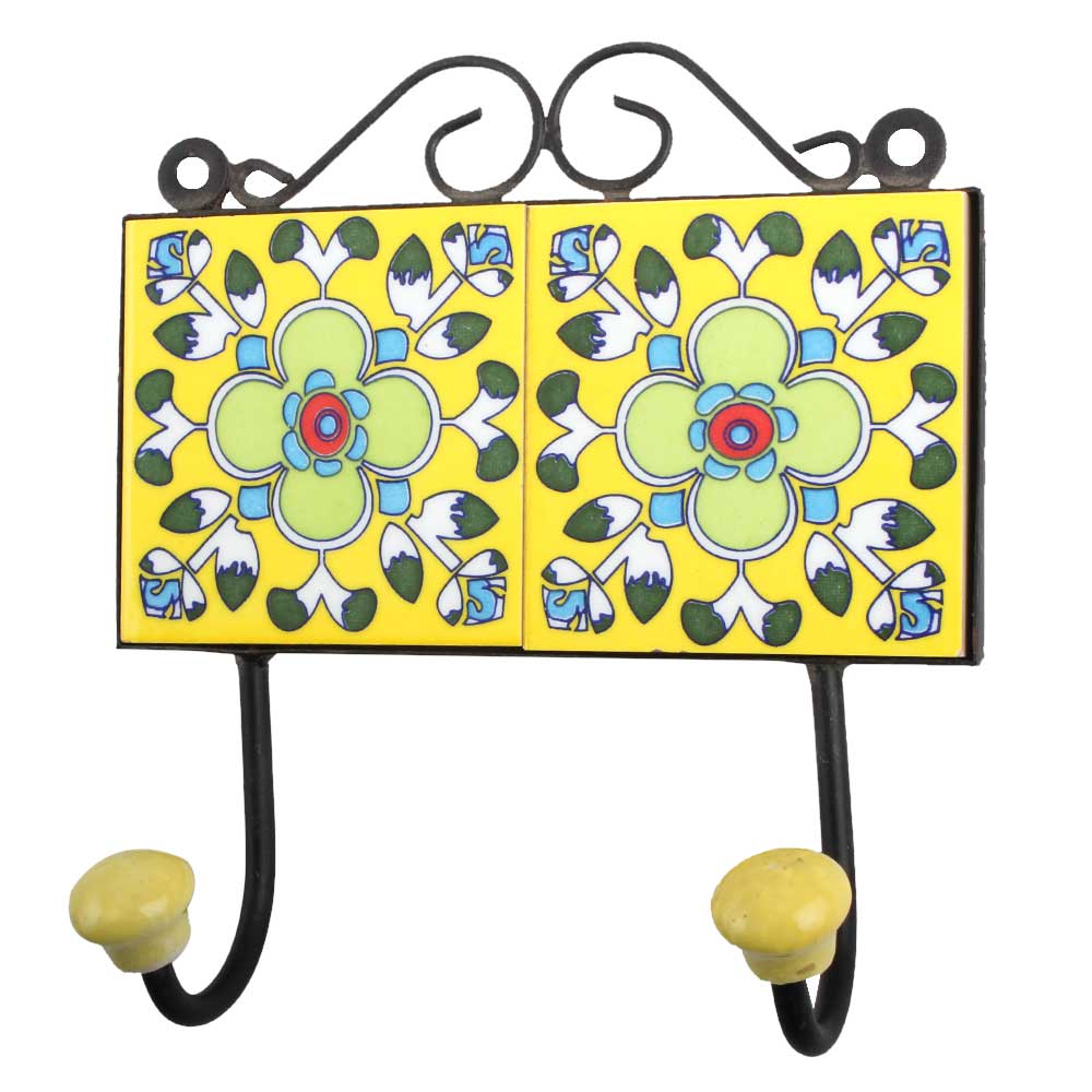Yellow Light Green Floral Tiles Hook. When Put on Wall or Cabinet It is An Art in Itself. the Metal Part of This Hook is Black Powder Coated.