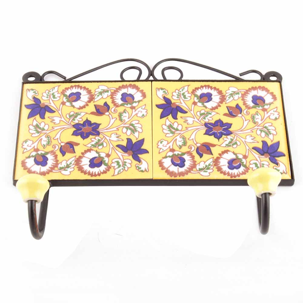 Yellow Navy Blue Floral Tiles Hooks.When Put on Wall or Cabinet it is an Art in itself. The Metal Part of this Hook is Black Powder Coated.