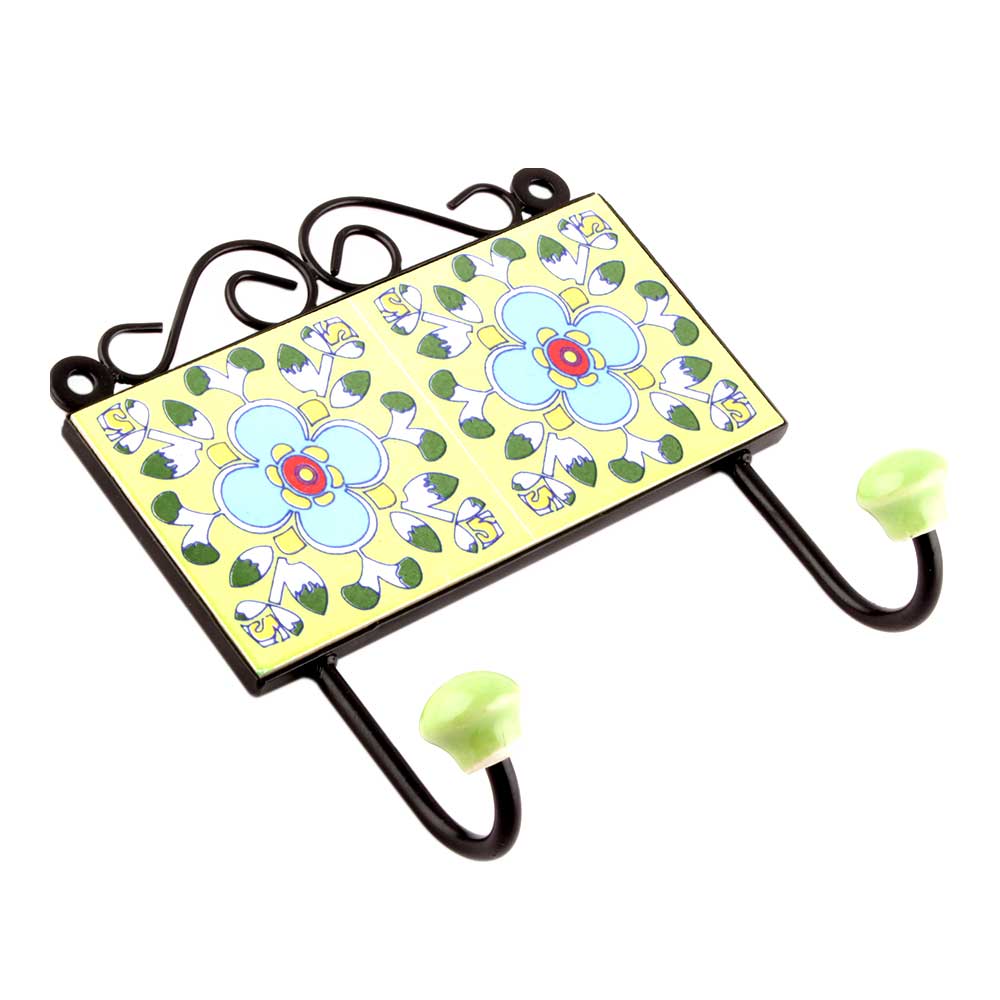 Yellow Turquoise Ceramic Floral Tiles Hooks. When Put on Wall or Cabinet it is an Art in itself. The Metal Part of this Hook is Black Powder Coated.