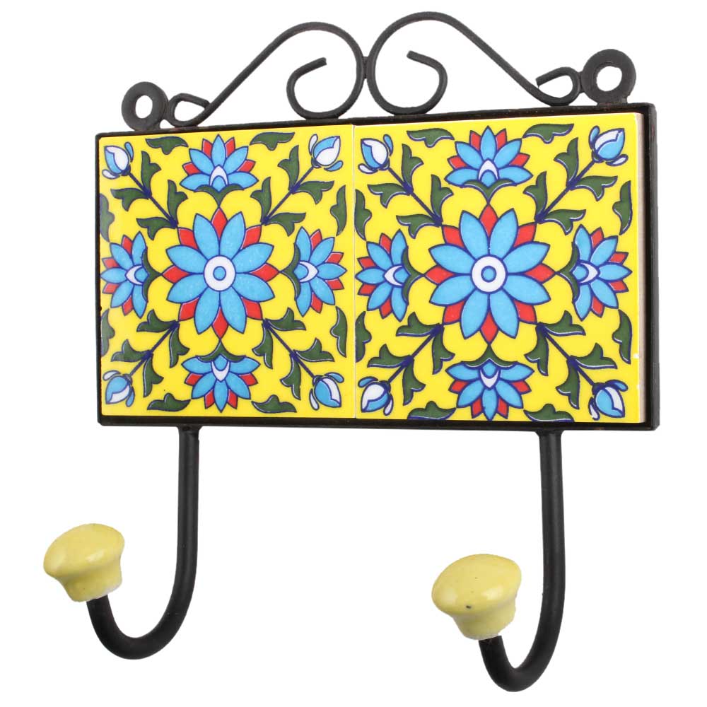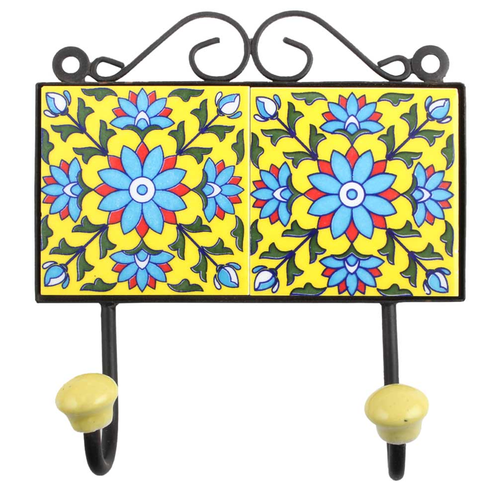 Yellow Turquoise Floral Tiles Hook.When put on wall or cabinet it is an art in itself. The metal part of this hook is black powder coated.
