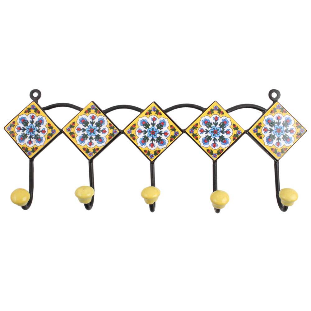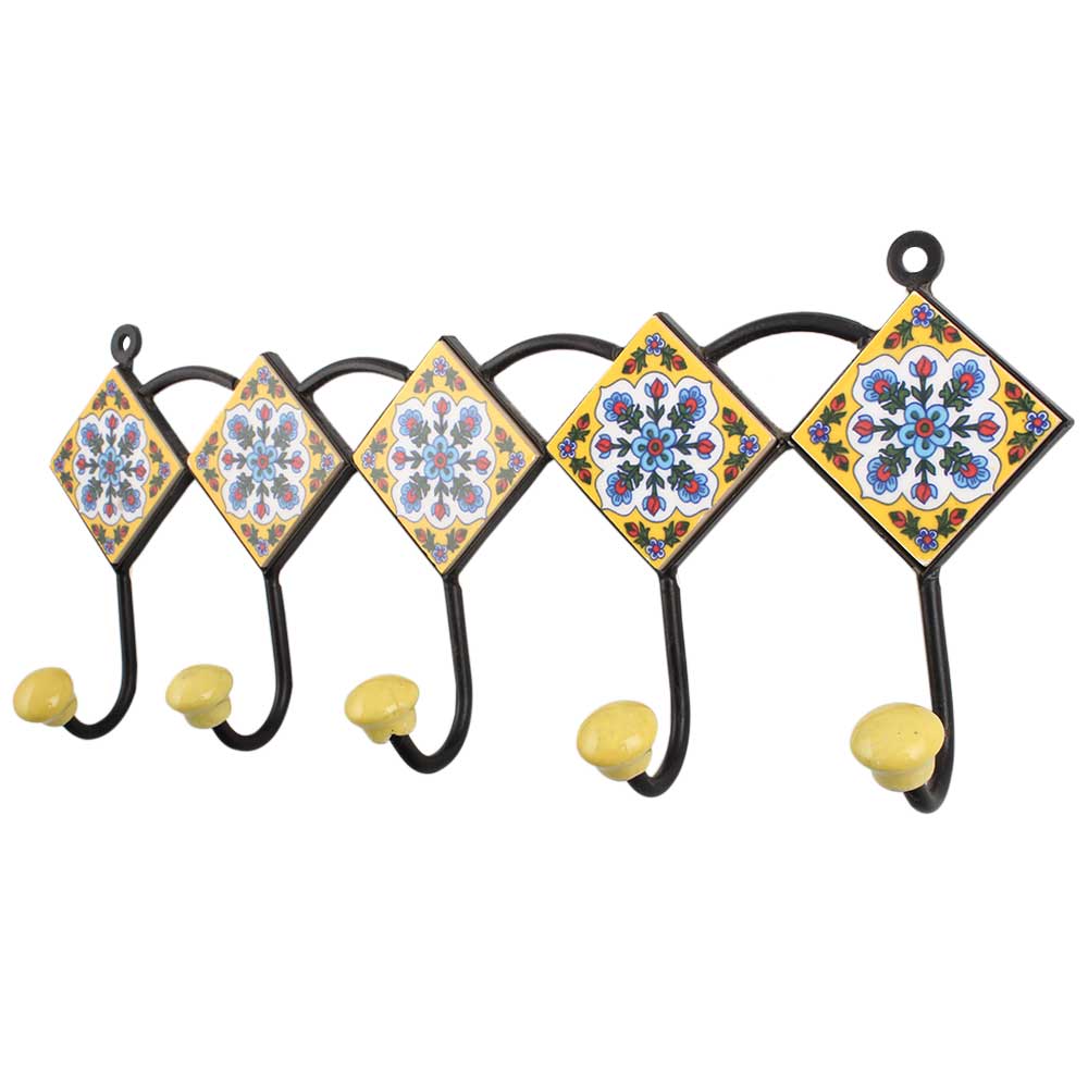 Yellow Turquoise Floral Tiles Hook. When Put on Wall or Cabinet It is An Art in Itself. the Metal Part of This Hook is Black Powder Coated.