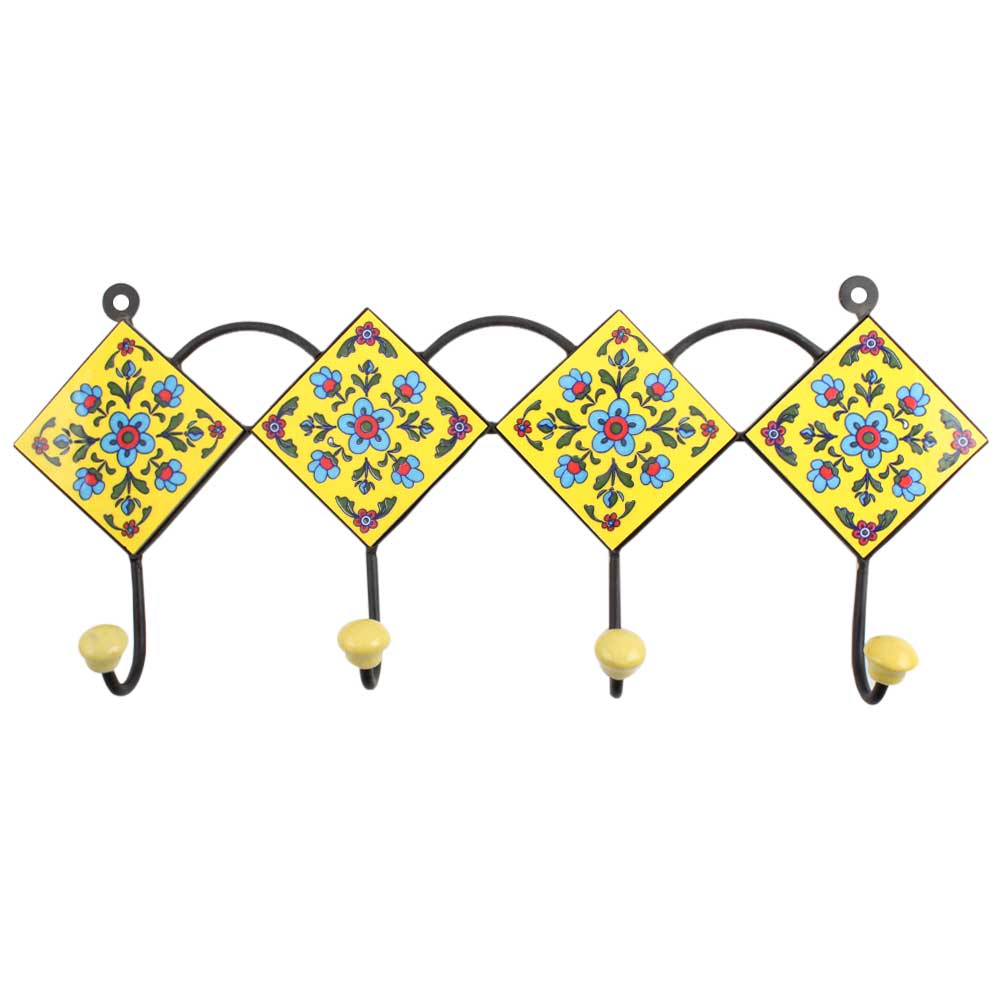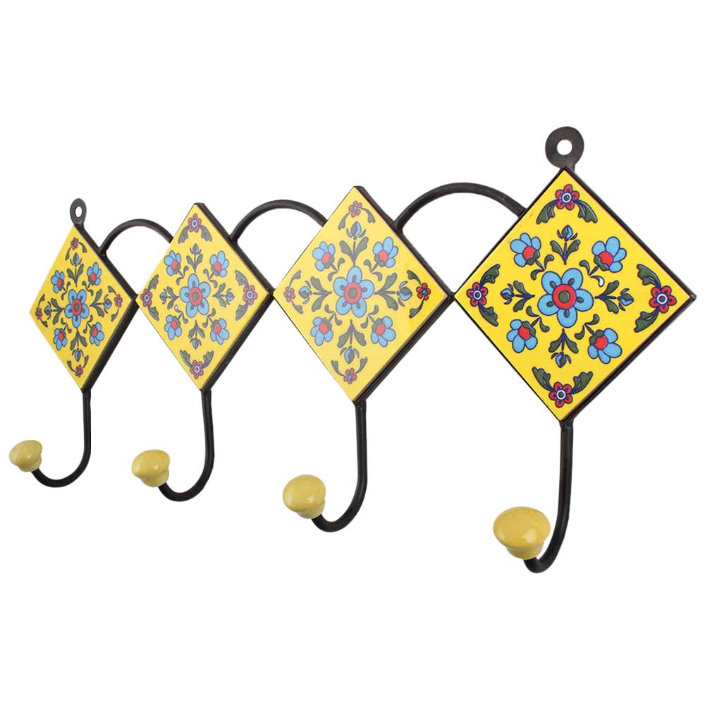 Yellow Turquoise Floral Tiles Hook. When Put on Wall or Cabinet It is An Art in Itself. the Metal Part of This Hook is Black Powder Coated.