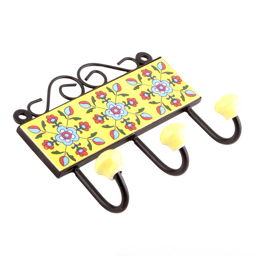 Yellow Turquoise Floral Tiles Hooks. WhenPut on Wall or Cabinet it is an Art in itself. The Metal Part of this Hook is Black Powder Coated.