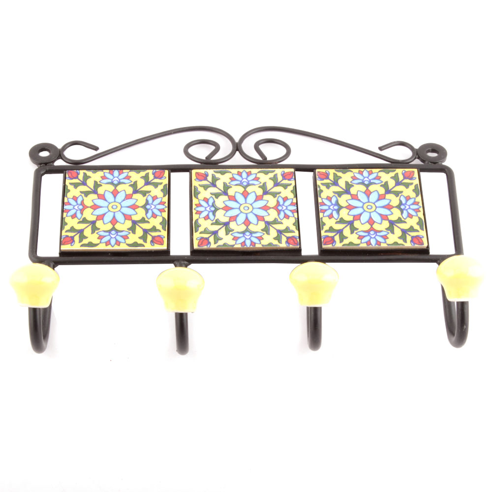 Yellow Turquoise Sun Flower Tiles Hooks. When Put on Wall or Cabinet it is an Art in itself. The Metal Part of this Hook is Black Powder Coated.