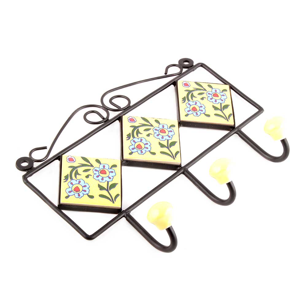 Yellow Turquoise Tiny Flower Tiles Hook.When Put on Wall or Cabinet it is an Art in itself. The Metal Part of this Hook is Black Powder Coated.