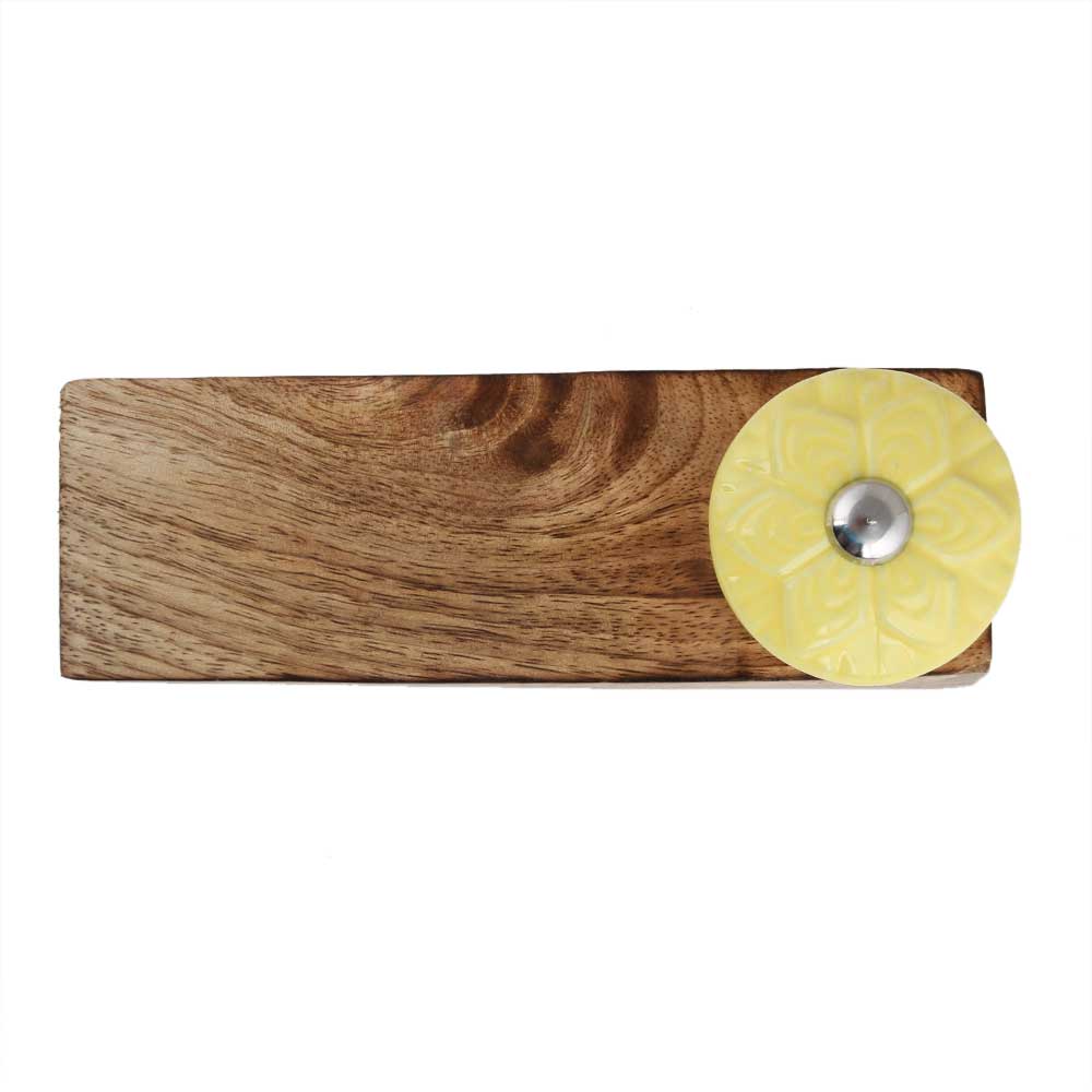 Yellow Wheel Flower Ceramic Wooden Door Stopper.Wooden Door Stopper with a Ceramic Knob to Carry it Easily. This Wooden Door Stopper has Glue Dots under it to Ensure that it does not Slip. It is Handmade by the Craftsmen of India and this Innovative Door Stopper won't Disappoint You.