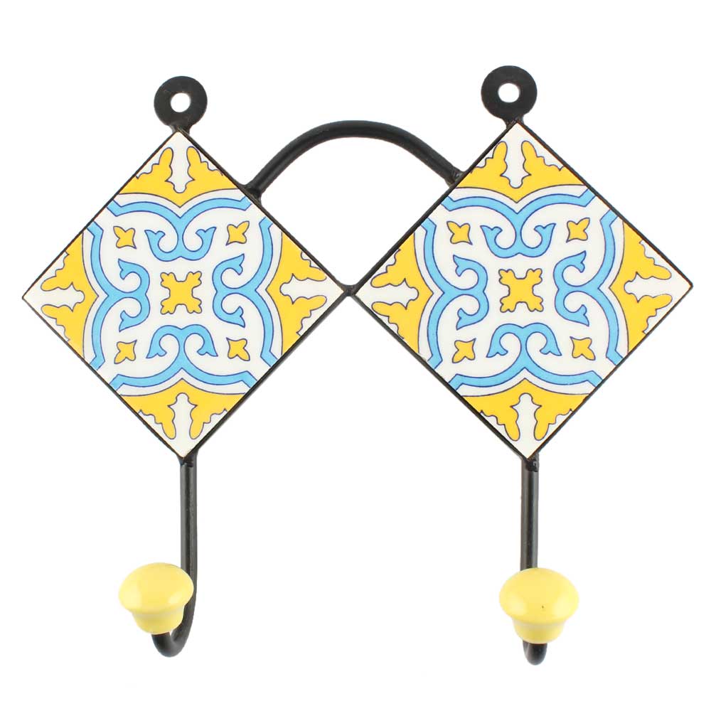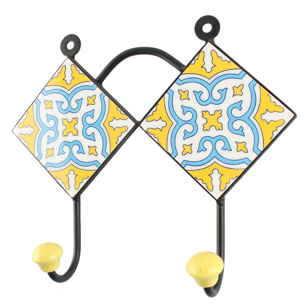 Yellow With Turquoise Floral Ceramic Tile Wall Hook. When Put on Wall or Cabinet It is An Art in Itself. The Metal Part of this Hook is Black Powder Coated.